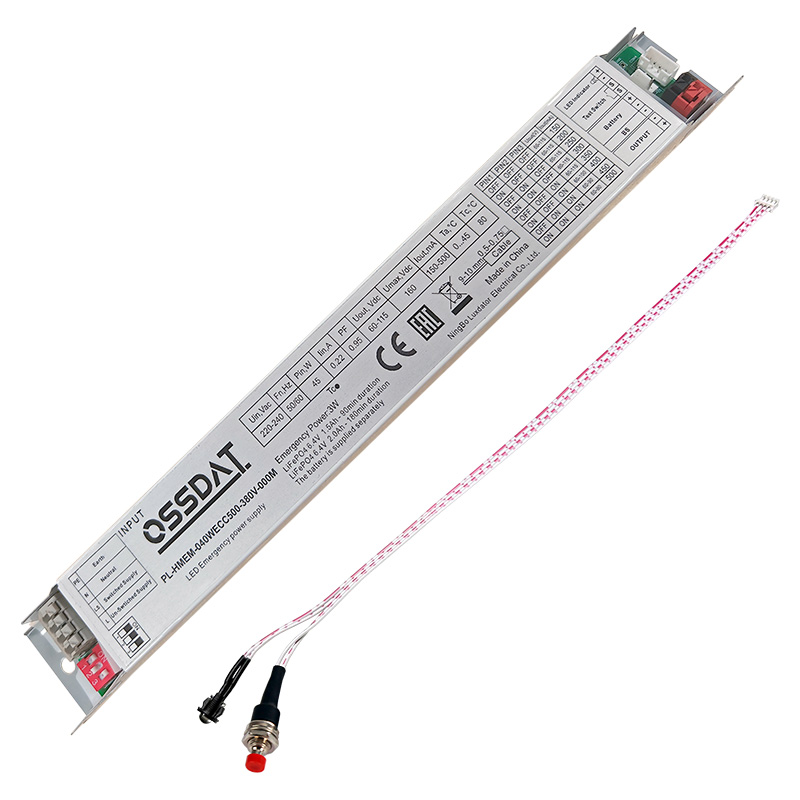 ИАП OSSDAT PL-HMEM-040WECC500-380V-000M. Источник аварийного питания для светодиодных светильников внутреннего освещения. Питание от встроенного БП. В комплекте тест-кнопка и индикатор. АКБ приобретается отдельно. С функцией самотеста. Защита от перенапряжения 380V. Смена вых. тока DIP-переключателем: 150/200/250/300/350/400/450/500 мА. Ta 0…+45°C.