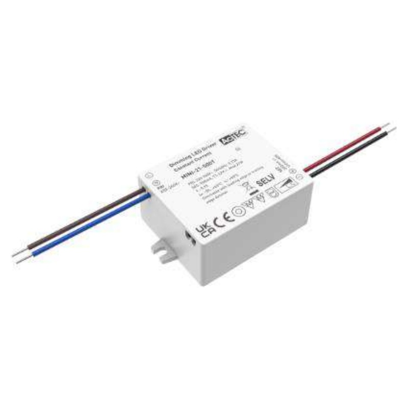 Драйвер тока AcTEC MINI-21-500T. Источник постоянного тока (блок питания) для стабильного питания светодиодной нагрузки LED светильников. 21 Вт / 500 мА / 21-42 В / Пластик / IP20 / Ta -20…+60°C. Диммирование Triac.