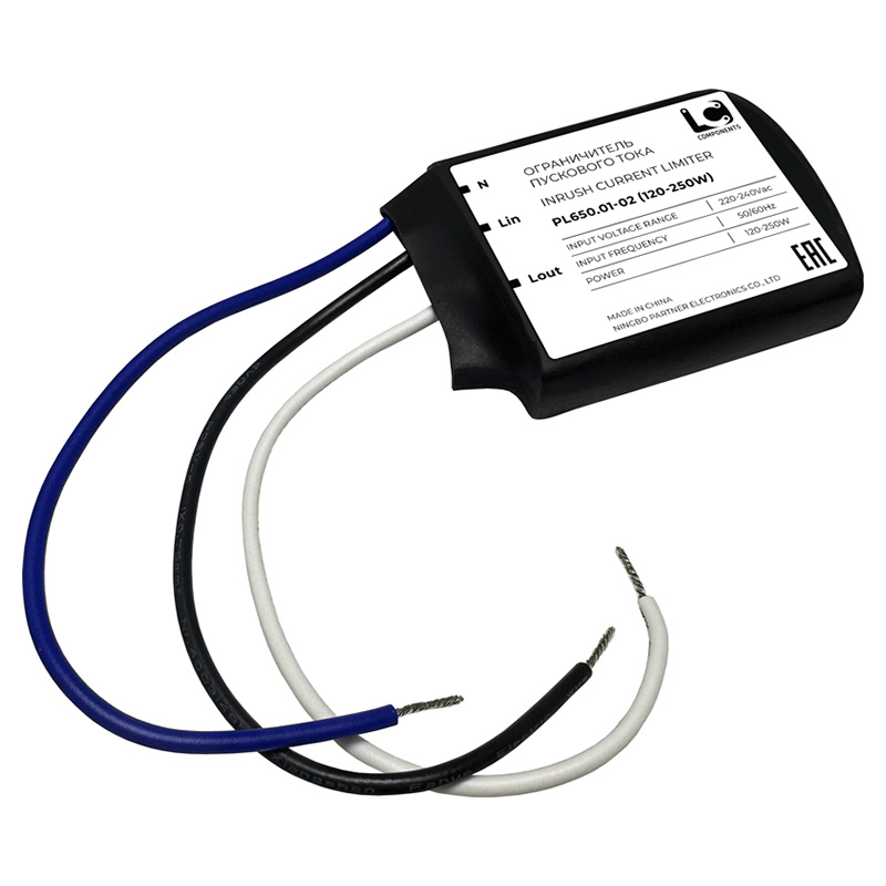 Ограничитель пускового тока LC PL650.01-02 (120-250W). Ограничитель пускового тока (ОПТ) для использования с блоками питания светодиодного освещения. Обеспечивает защиту от микросекундных импульсов большой энергии (МИПс) 6 кВ (SPD). Мощность нагрузки не более 250 Вт. Ограничение пускового тока не более 1,3 А. Длительность ограничения пускового тока 0,3 с. Потребляемый ток 7 мА. Масса 30 г. Ta -40 … +80 °C.