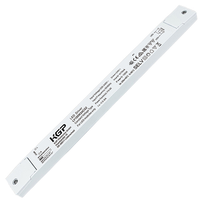 Драйвер напряжения KGP LV100W24CG2. Преобразователь AC-DC, 100Вт, IP20, вход 176…264В AC, 47…63Гц/175…280В DC, выход 24В/0…4.17А, изоляция 3000В AC, пластиковый корпус 350х30х18мм, -25…+45°С