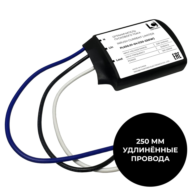 Ограничитель пускового тока LC PL650.01-04 (120-250W). Ограничитель пускового тока (ОПТ) для использования с блоками питания светодиодного освещения. Обеспечивает защиту от микросекундных импульсов большой энергии (МИПс) 6 кВ (SPD). Мощность нагрузки не более 250 Вт. Ограничение пускового тока не более 1,3 А. Длительность ограничения пускового тока 0,3 с. Потребляемый ток 7 мА. Масса 30 г. Ta -40 … +80 °C. Провода длиной 250 мм.
