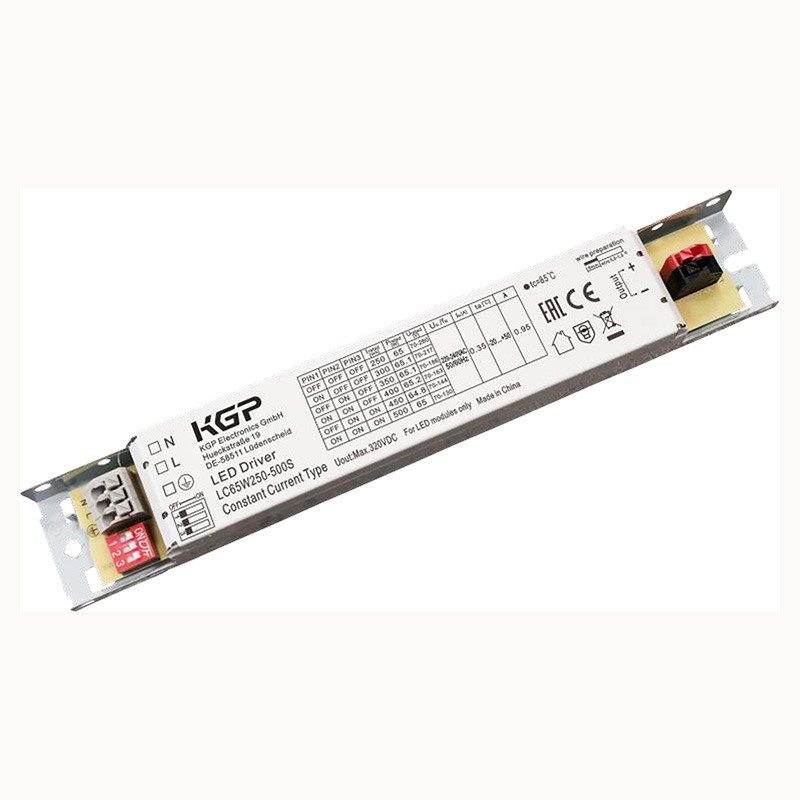 Драйвер тока KGP LC65W250-500S. Источник постоянного тока (блок питания) для стабильного питания светодиодной нагрузки LED светильников. 65 Вт / 500 мА / 70-130 В / Металл / IP20 / Ta -20…+50°C. Смена вых. тока DIP-переключателем 250/300/350/400/450/500 мА.