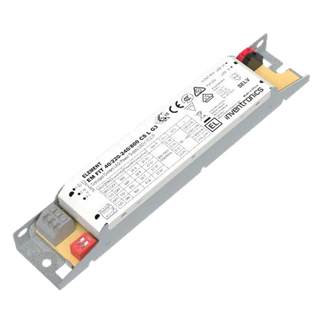 Драйвер тока INVENTRONICS EM FIT 40/220-240/800 CS L G3. Линейный блок питания (светодиодный драйвер тока) для внутреннего освещения и аварийных светильников. 40 Вт / 500–800 мА / 27–51 В / -30…+60°С / IP20. Выбор тока DIP-переключателем. SELV изоляция. Пульсации < 3% (без мерцания).