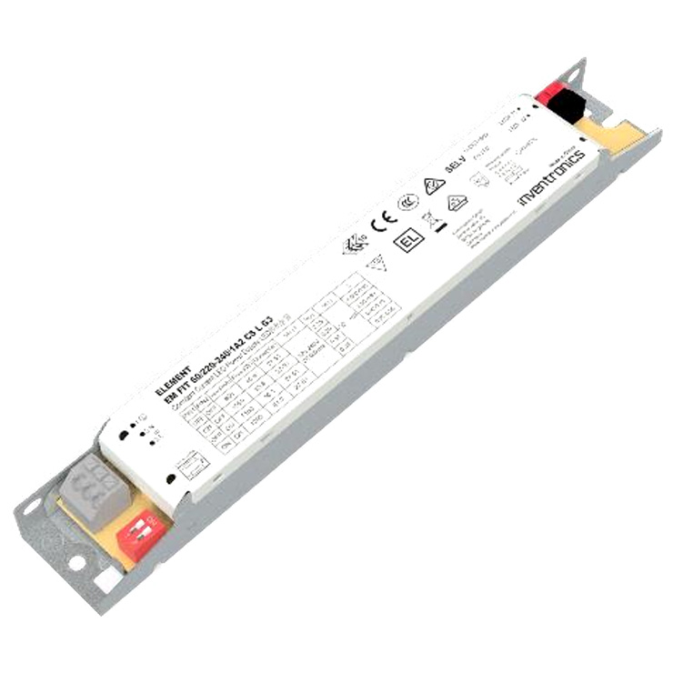 Драйвер тока INVENTRONICS EM FIT 60/220-240/1A2 CS L G3. Линейный блок питания (светодиодный драйвер тока) для внутреннего освещения и аварийных светильников. 60 Вт / 900–1200 мА / 27–51 В / -30…+60°С / IP20. Выбор тока DIP-переключателем. SELV изоляция. Пульсации < 3% (без мерцания).