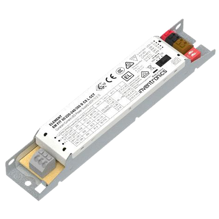 Драйвер тока INVENTRONICS EM FIT 60/220-240/350 D CS L CCT. Линейный блок питания (светодиодный драйвер тока) для внутреннего освещения и аварийных светильников. 60 Вт / 200–350 мА / 90-175 В / -30…+60°С / IP20. Выбор тока DIP-переключателем. Не изолированный. Пульсации < 3% (без мерцания). Поддержка CCT.