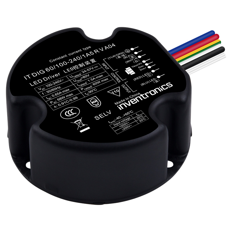 Драйвер тока INVENTRONICS IT DIG 60/100-240/1A5 R V A04. Круглый изолированный блок питания (LED-драйвер) для промышленного освещения. 60 Вт / 1050-1500 мА (Constant Power) / 24-57 В / -40…+65°С / IP65. Аналоговое диммирование 0–10 В. Гальваническая развязка, высокая энергоэффективность и защита от микросекундных импульсов (Surge Protection).